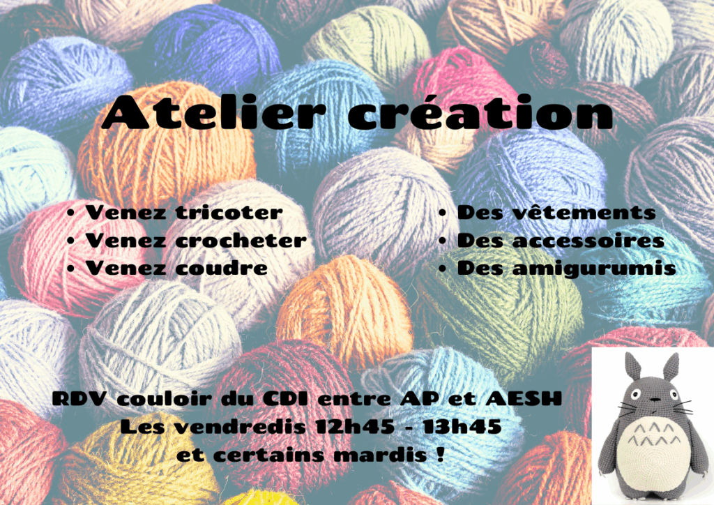 Un club de couture, tricot, crochet ouvre ses portes à côté du CDI. Ouvert à toutes et à tous, il propose une initiation avec de petits projets, ou un accompagnement pour les créateurs confirmés.