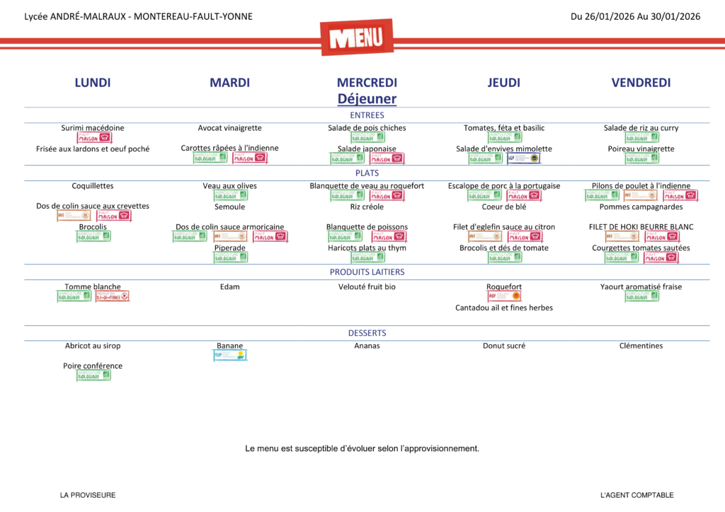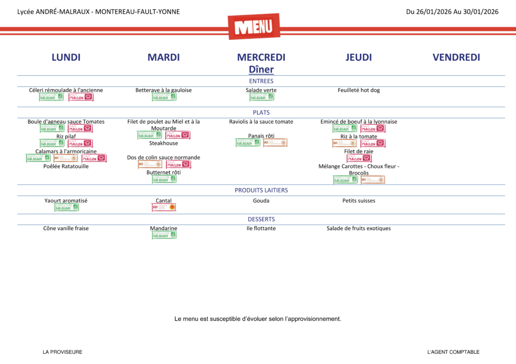 Menu de la cantine : du 26 janvier au 30 janvier 2026Published by Administrateurs on 25 janvier 202625 janvier 2026 Catégories : Gestion Tags: Menu de la cantine