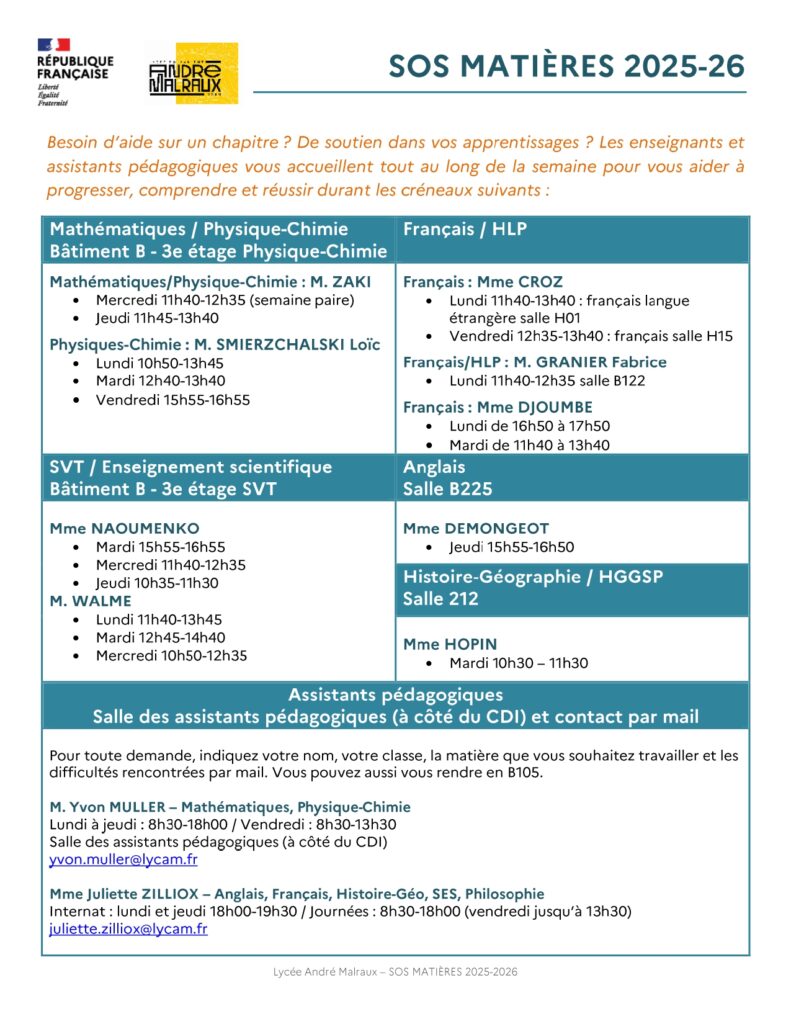Message de l’administration Chers élèves de Terminale,Mesdames, Monsieur les responsables, Dans le cadre de la préparation du baccalauréat, le lycée André Malraux met en place un dispositif spécifique SOS Grand Oral, destiné à accompagner les élèves dans la Lire la suite