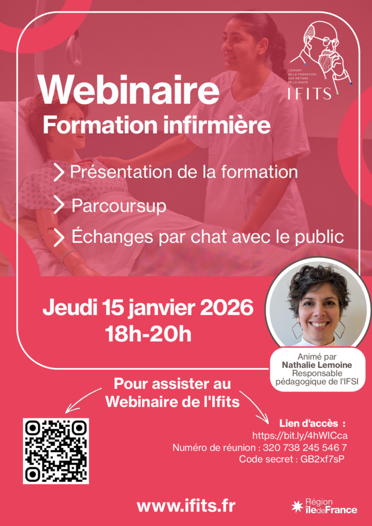 L’Ifits organise un Webinaire à l’attention des lycéens souhaitant se renseigner sur la formation infirmière. Ce webinaire sera animé par Nathalie Lemoine, responsable pédagogique de l’IFSI (IFITS – Neuilly-sur-Marne).